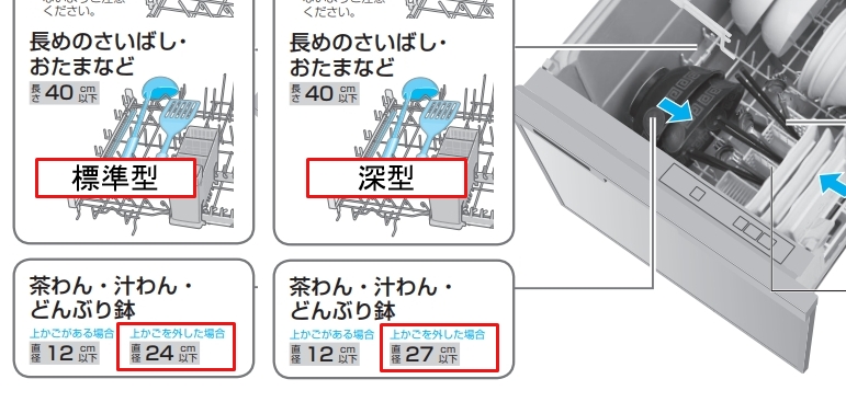 食洗機の浅型と深型の違いはメーカーの説明では「食器点数」の違いが強く押し出されています。